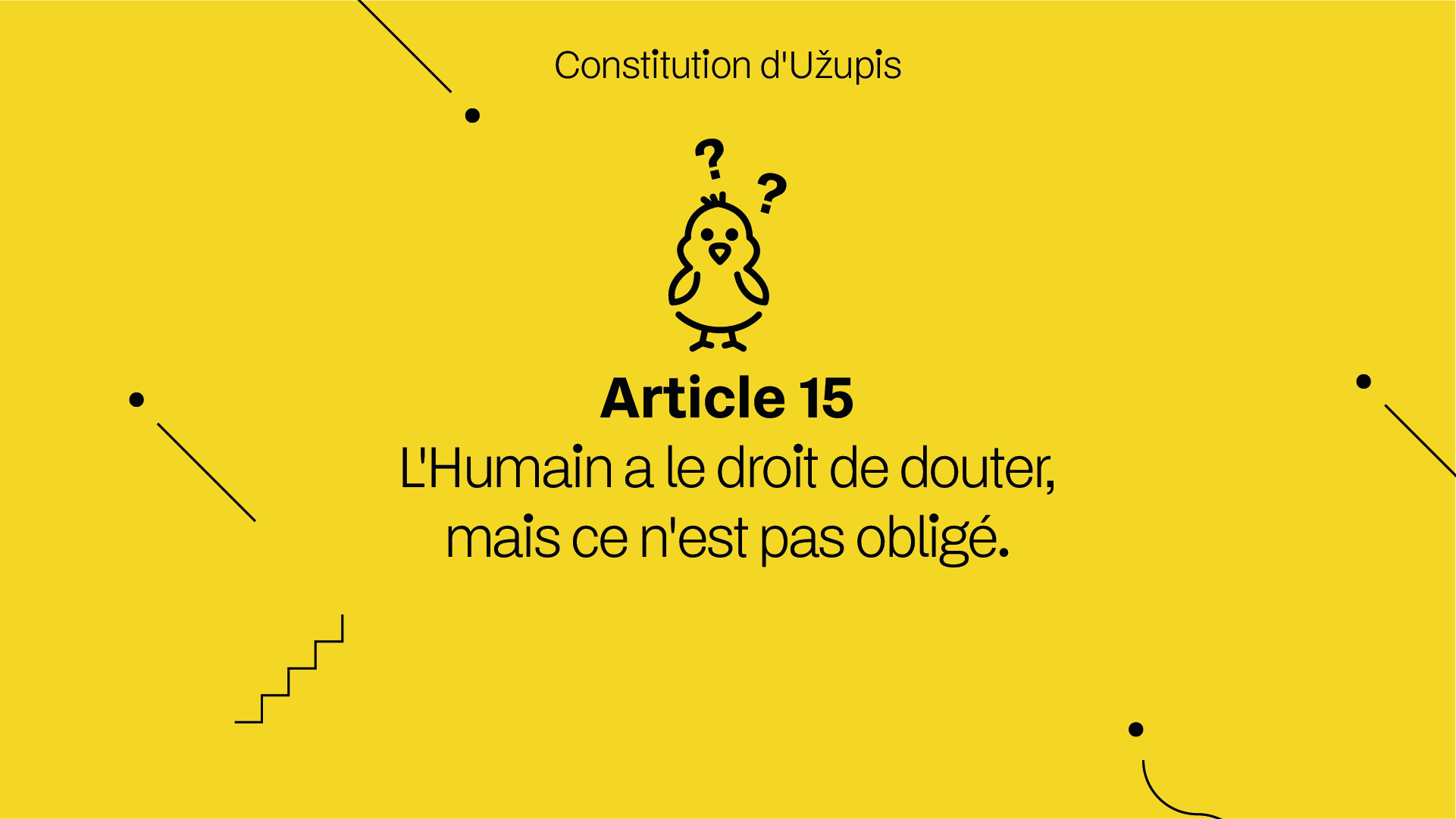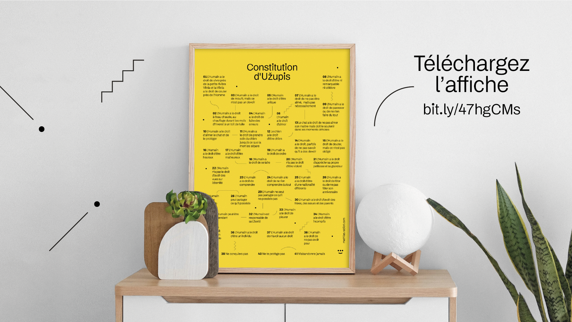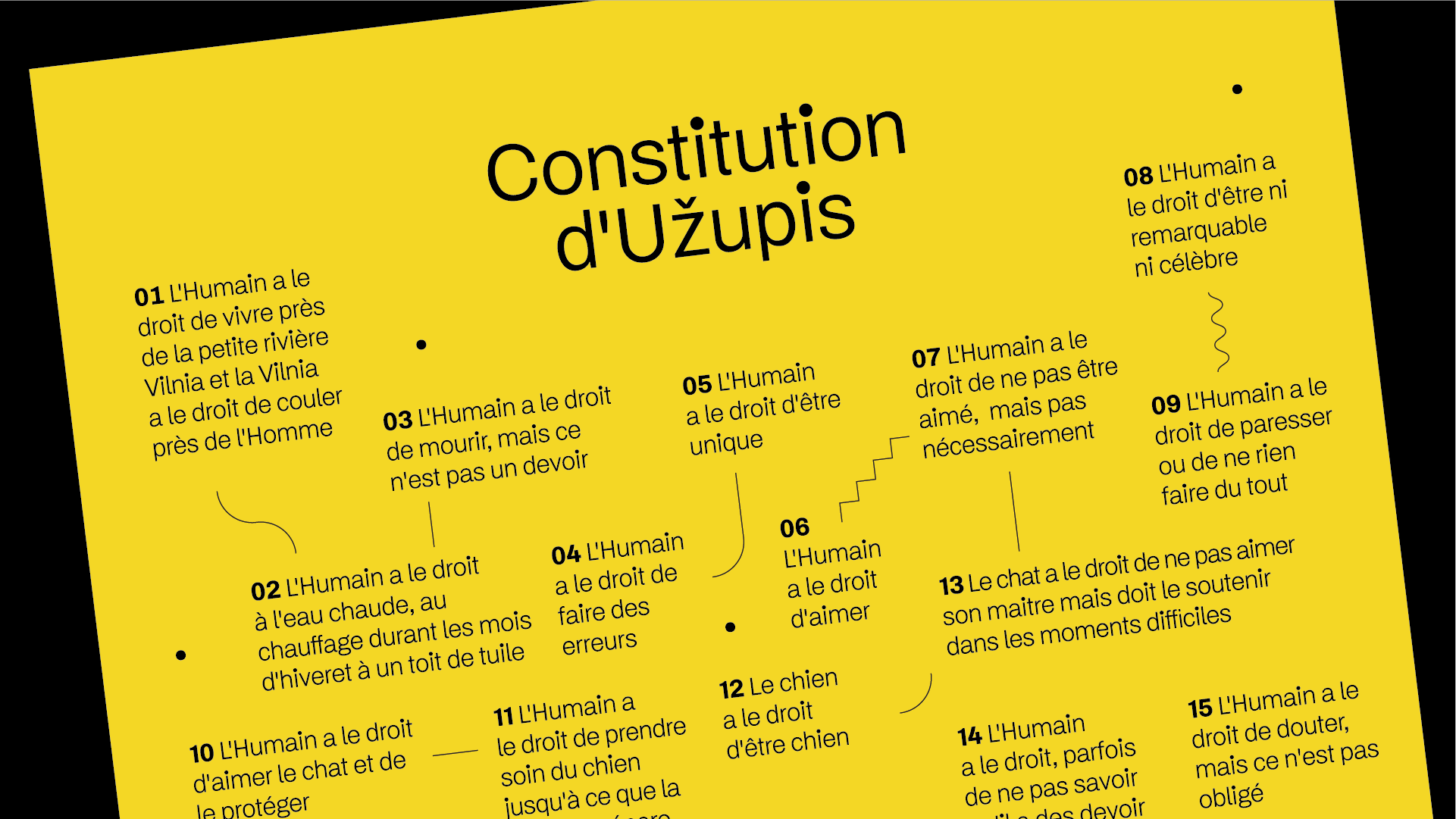 Užupis, quartier bohème de Vilnius, s’est proclamé en 1997 République indépendante. Elle possède sa Constitution, un président à vie, une reine élue chaque année, une monnaie (l’eurouz) et un journal (Uzupia Haroldas). Le projet, décrit par son ministre des Affaires étrangères Tomas Tchepaitis, n’est pas de refonder le monde mais de créer une utopie vivable, joyeuse et poétique, un refuge où l’on peut « disparaître » ou se protéger.