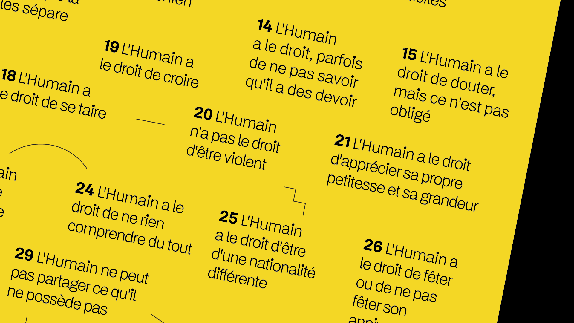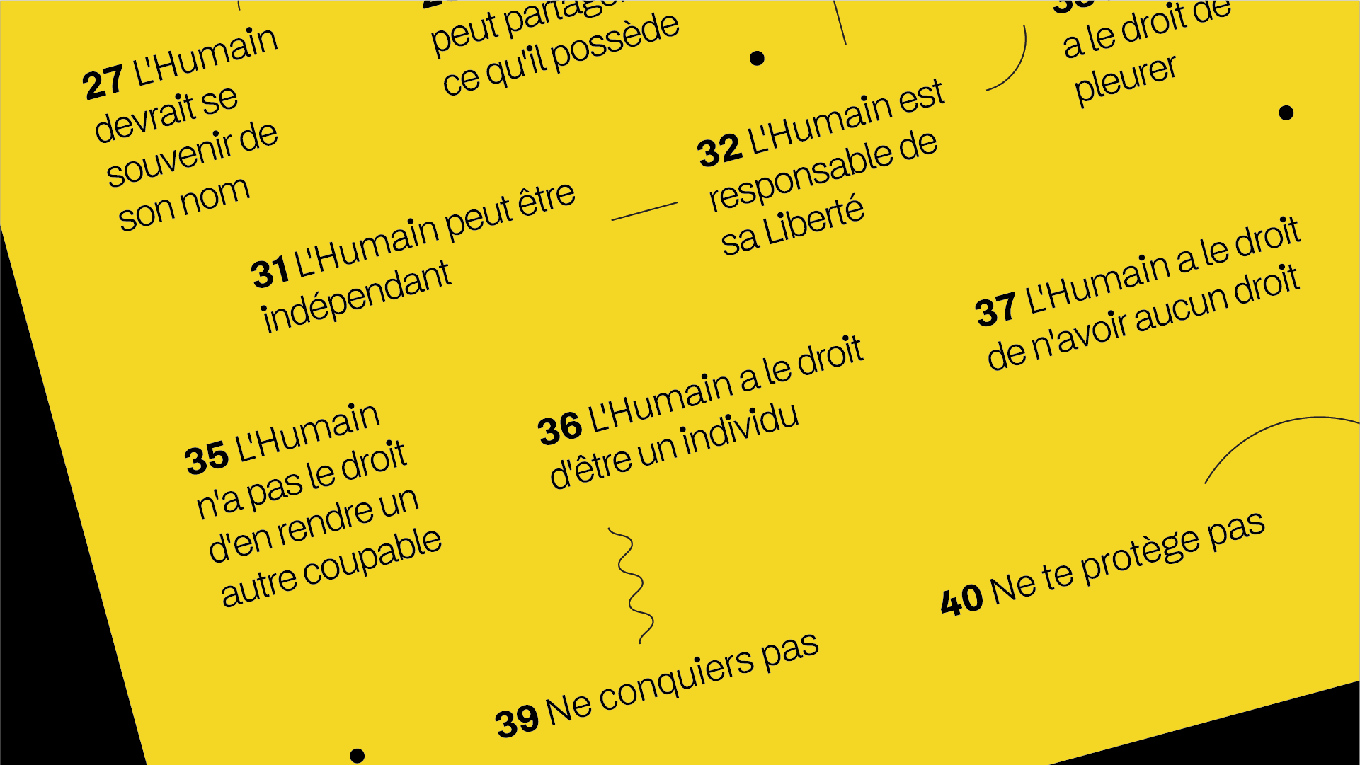 La Constitution énonce des droits décalés et poétiques (droit à la paresse, à la naïveté, à s’envoler avec les oies sauvages, etc.), reflet de son esprit libertaire et humoristique. La devise : « Ne conquiers pas, ne te protège pas, n’abandonne jamais. »