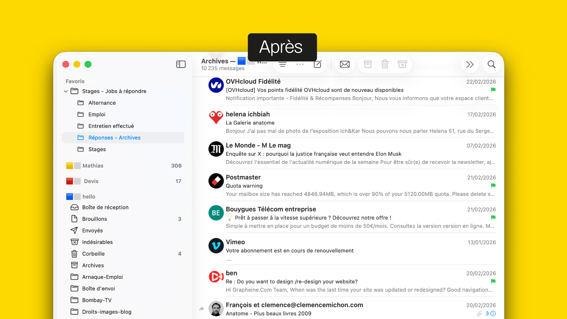 Seulement, lorsque l’on reçoit de nombreux emails de personnes ou services inconnus, qui ne sont pas dans « Contacts », il n’y a que des icônes grises avec les initiales. Pas très visuel !